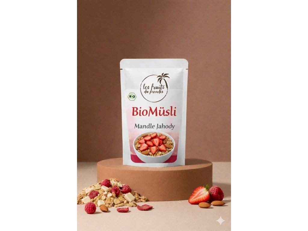 BioMusli Mandle & Jahody je lahodná a zdravá směs, která spojuje sílu přírody a vyváženou chuť. Základ tvoří cereální vločky (60 %) – ovesné, pšeničné a ječné – pocházející z ekologického zemědělství. Jemně křupavé mandle (5 %) a sladkokyselé lyofilizované jahody (4 %) dodávají směsi výraznou chuť a přirozenou svěžest. O sladkost se postarají rozinky sultánky, doplněné o exotické kokosové a banánové chipsy, lahodné papájové kostičky a voňavé mango kostky. O nutriční hodnotu se starají dýňová semínka a lněná semínka, bohatá na vlákninu, minerály a omega-3 mastné kyseliny.
