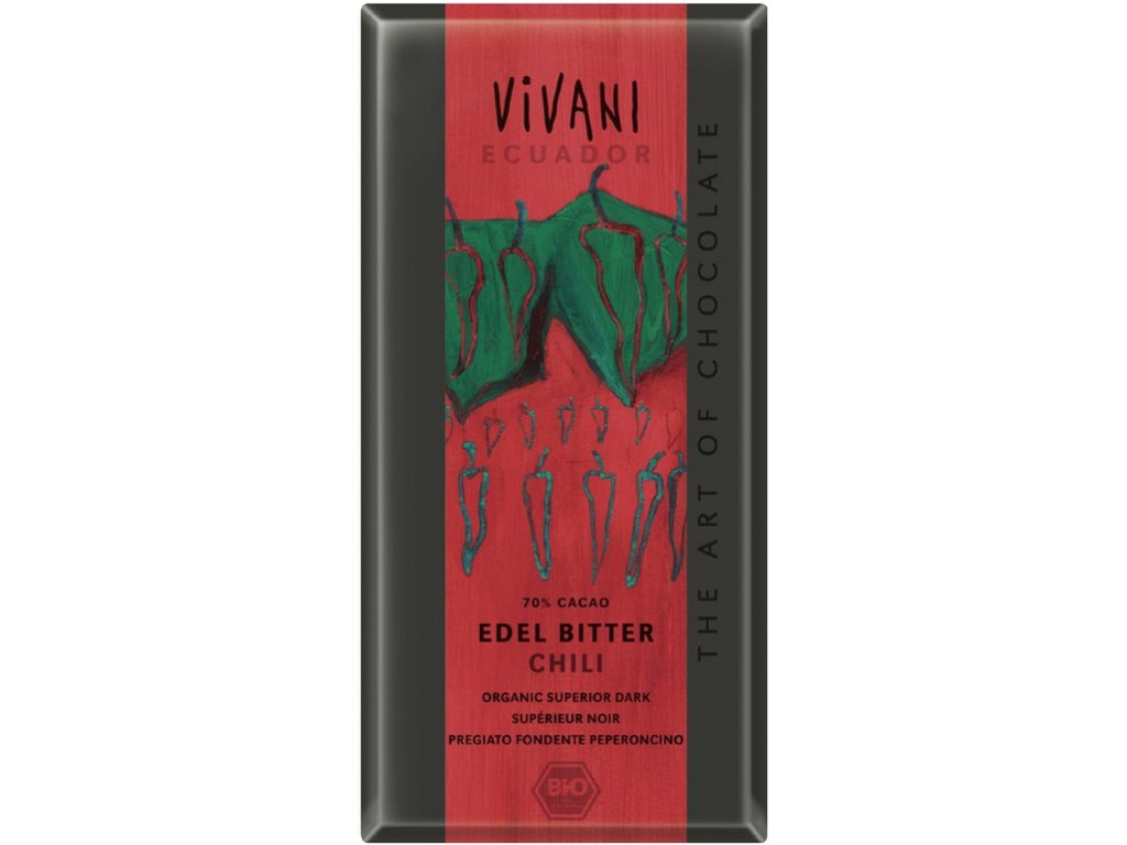 Bio hořká čokoláda s chili Charakteristickou chuť a vůni propůjčuje této čokoládě ta nejjemnější "Arriba" kakao pocházející přímo od malých sdružení farmářů hospodařících v tropickém deštném pralese v Ekvádoru - původní domovině kakaa. Sušené ostré papričky dodají rafinovanou pálivou chuť . Je slazená přírodním třtinovým cukrem a neobsahuje sójový lecitin ani žádný jiný emulgátor. Díky velkému formátu můžete nechat tenké plátky čokolády pomalu rozplývat na jazyku a vychutnávat intensivní kakaovou chuť. Tato čokoláda získala nejvyšší zlaté ocenění od Německé zemědělské společnosti (DLG). VIVANI čokoláda: 34 ojedinělých příchutí z Bio surovin přirozená chuť z prvotřídního kakaa a másla bez sojového lecitinu, emulgátoru vyrobeno v Německu Čokolády značky VIVANI jsou vyráběny německou rodinnou firmou Ludwiga Weinricha. Rodina vyrábí čokolády již déle než jedno století. Tradice a zkušenost spolu s nejlepšími bio surovinami, moderním vybavením a pečlivou kontrolou jsou zárukou vysoké kvality.