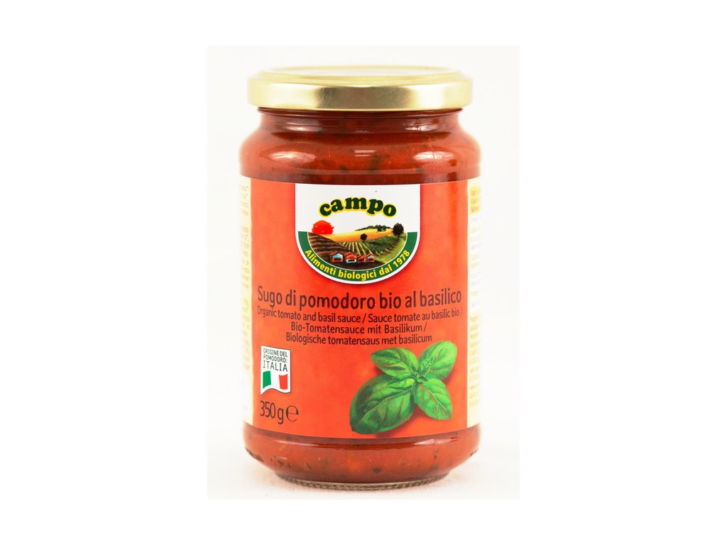 Složení: Nakrájená loupaná rajčata* 40 %, rajčatové pyré* 40 %, celer*, mrkev*, cibule*, extra panenský olivový olej*, bazalka* 1,3 %, sůl, fruktóza *z ekologického zemědělství