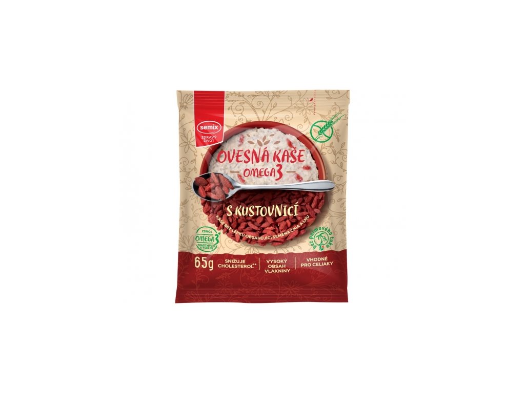 Unikátní ovesná kaše omega 3 s kustovnicí bez lepku obsahuje ve 100 g 2 g kyseliny alfa-linolenové (z řady omega-3 mastných kyselin). Rychlá příprava! Nevaří se! Připravte si chutnou zdravou snídani nebo svačinu s obsahem betaglukanů. Ovesný betaglukan snižuje hladinu cholesterolu v krvi. Příznivého účinku je dosaženo na základě denního příjmu 3 g ovesného betaglukanu. Jedna porce této kaše 65 g obsahuje 1,7 g ovesného betaglukanu.Pro udržení pevného zdraví je nutno dodržovat zásady zdravého životního stylu a konzumovat pestrou a vyváženou stravu. Složení: OVESNÉ vločky bez lepku 60 %, cukr, semeno chia 9 %, sušené MLÉKO odstředěné, kustovnice 4 %, ovocný prášek marakuja (maltodextrin, koncentrát marakuja, přírodní aroma, regulátor kyselosti: kyselina citrónová), len 2,4 %, olivový olej, mořská sůl, aroma.