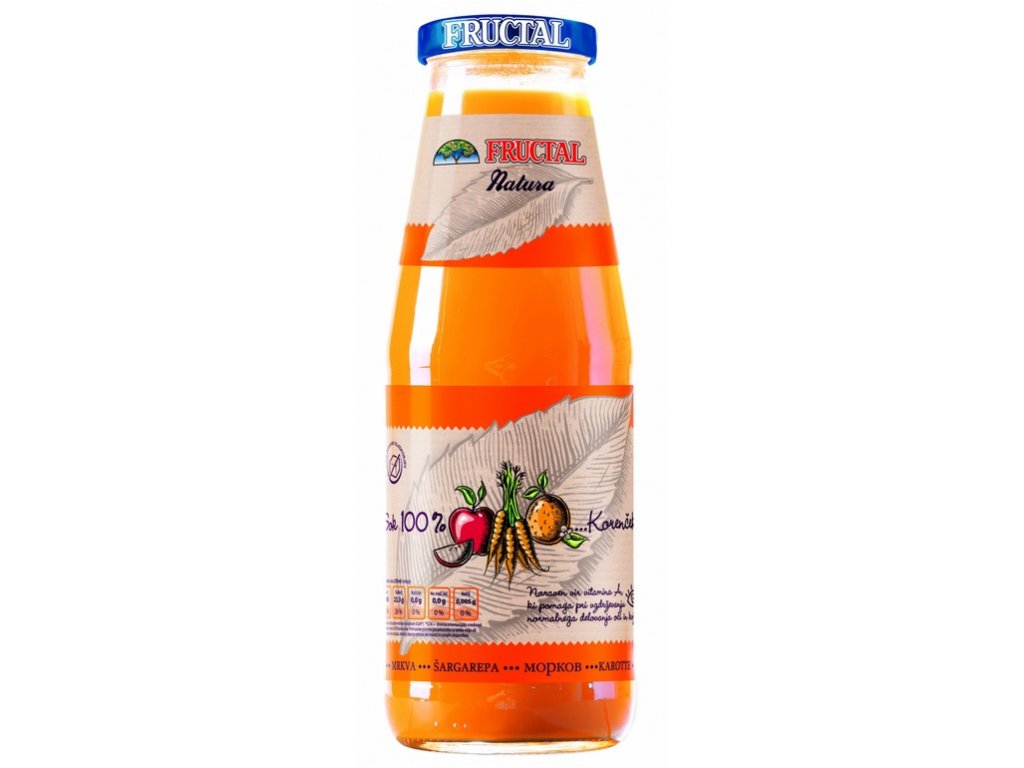 Fructal šťáva je zcela přírodní šťáva. Má 100% podíl ovoce a zeleniny neobsahující žádné přísady. Šťávy jsou bez přidaného cukru, obsahují pouze cukry, které se přirozeně vyskytují v zelenině a ovoci. Na první pohled se zdá, že ovoce a zelenina nejdou dohromady. Ale to není pravda. Zkuste zelenino-ovocné šťávy Natura. Pokud zavřete oči, budete jasně cítit svěžest mrkve, jablek a smyslnou šťavnatost pomeranče. Vhodné pro diabetiky.